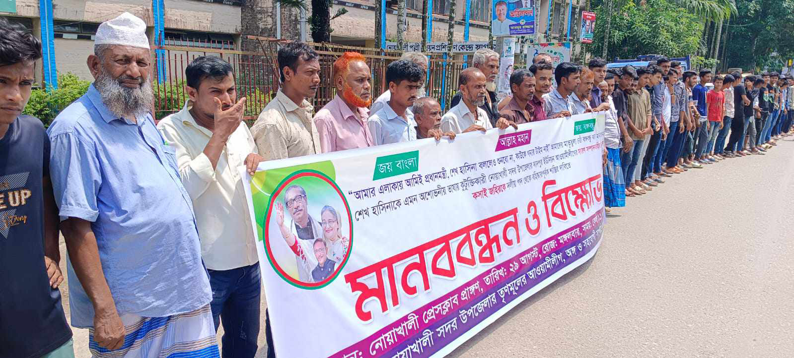 বক্তারা আরো বলেন, আমাদের মাতৃতুল্য নেত্রীকে কটূক্তি করার প্রায় এক মাস অতিবাহিত হলেও কটূক্তিকারী জহির উদ্দিন ওরপে কসাই জহিরের বিরুদ্ধে সাংগঠনিক কোন ব্যবস্থা নেয়নি জেলা ও উপজেলা আওয়ামী লীগ। বরং কসাই জহিরের কটূক্তির প্রতিবাদ করায় জহির ও তাঁর সন্ত্রাসী বাহিনী স্থানীয় আওয়ামী লীগের নেতাকর্মিদের হামলা-মামলার হুমকি-দুমকি দিয়ে আসছে। প্রধানমন্ত্রী শেখ হাসিনাকে কটূক্তিকারী কসাই জহিরকে ইউনিয়ন আওয়ামী লীগের সাধারণ সম্পাদকের পদ থেকে বহিষ্কারসহ দৃষ্টিন্তমূলক শাস্তি প্রদানের দাবি জানান মানববন্ধন ও বিক্ষোভে অংশ নেওয়া উপজেলার বিভিন্ন ইউনিয়ন আওয়ামী লীগের সভাপতি, সম্পাদকসহ অঙ্গ ও সহযোগী সংগঠনের নেতাকর্মিরা।