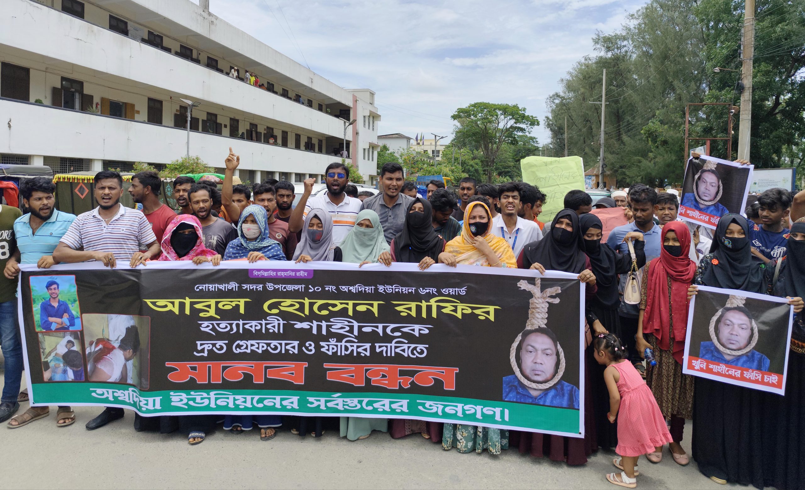 নোয়াখালীর সদর উপজেলার অশ্বদিয়া ইউনিয়নে ছাত্রদলকর্মি আবুল হোসেন রাফির (১৯) হত্যাকারীকে দ্রুত গ্রেপ্তার ও বিচারের দাবিতে জেলা প্রশাসকের কার্যালয়ের সামনে মানববন্ধন ও বিক্ষোভ সমাবেশ করা হয়েছে।