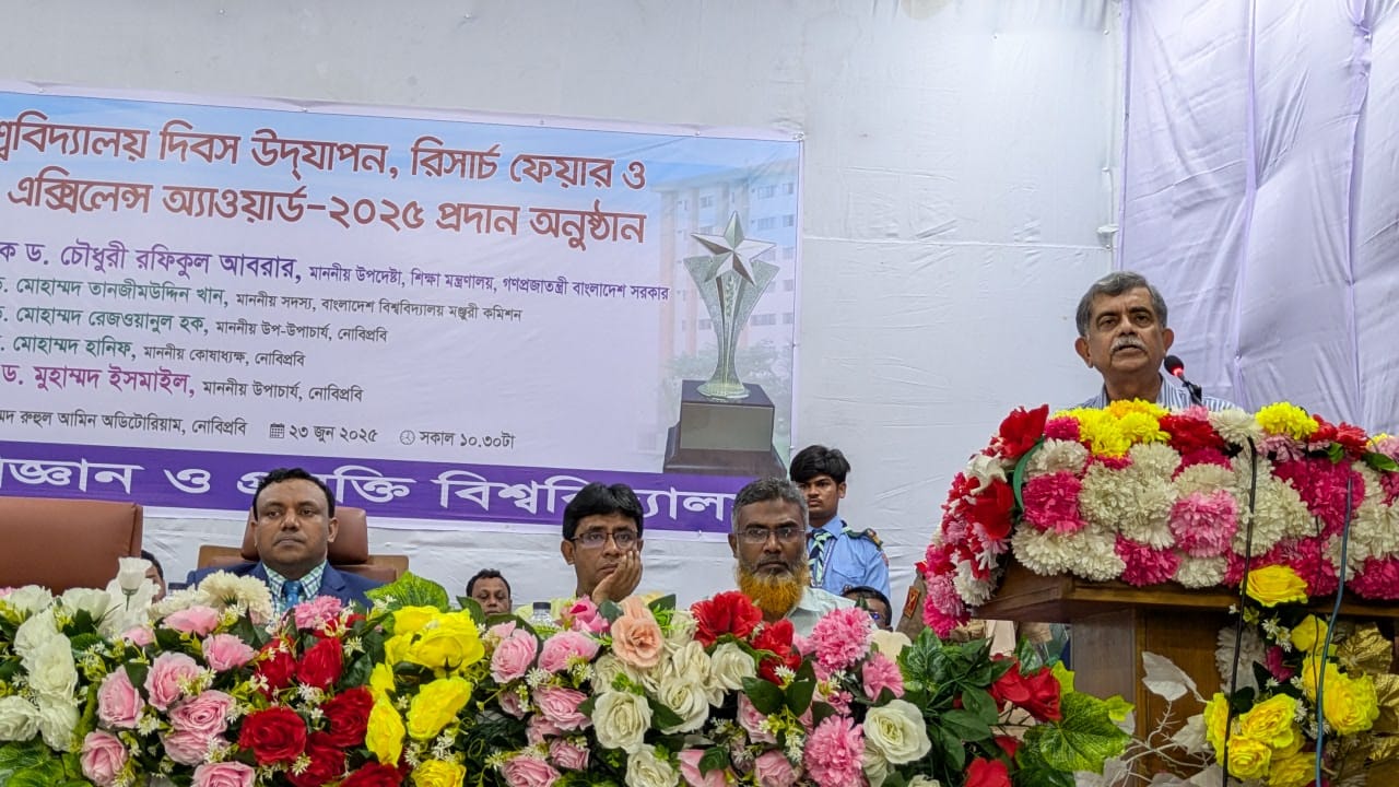 সোমবার (২৩ জুন) দুপুরের দিকে মুহাম্মদ রুহুল আমিন অডিটোরিয়ামে নোয়াখালী বিজ্ঞান ও প্রযুক্তি বিশ্ববিদ্যালয়ের (নোবিপ্রবি) ১৯তম বিশ্ববিদ্যালয় দিবস উদযাপন, রিসার্চ ফেয়ার এবং একাডেমিক এক্সিলেল অ্যাওয়ার্ড অনুষ্ঠানে প্রধান অতিথির বক্তব্যে তিনি এসব কথা বলেন অনুষ্ঠানে সভাপতিত্ব করেন বিশ্ববিদ্যালয়ের উপাচার্য অধ্যাপক ড. মুহাম্মদ ইসমাইল।