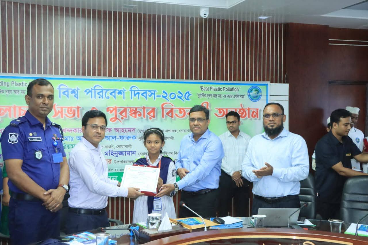 এরপর জেলা প্রশাসকের সম্মেলন কক্ষে বিশ্ব পরিবেশ দিবস- ২০২৫ উপলক্ষ্যে আলোচনা সভা ও পুরষ্কার বিতরণী অনুষ্ঠান অনুষ্ঠিত হয়। সভায় প্রধান অতিথি হিসেবে উপস্থিত ছিলেন নোয়াখালী জেলা প্রশাসক জনাব খন্দকার ইসতিয়াক আহমেদ।