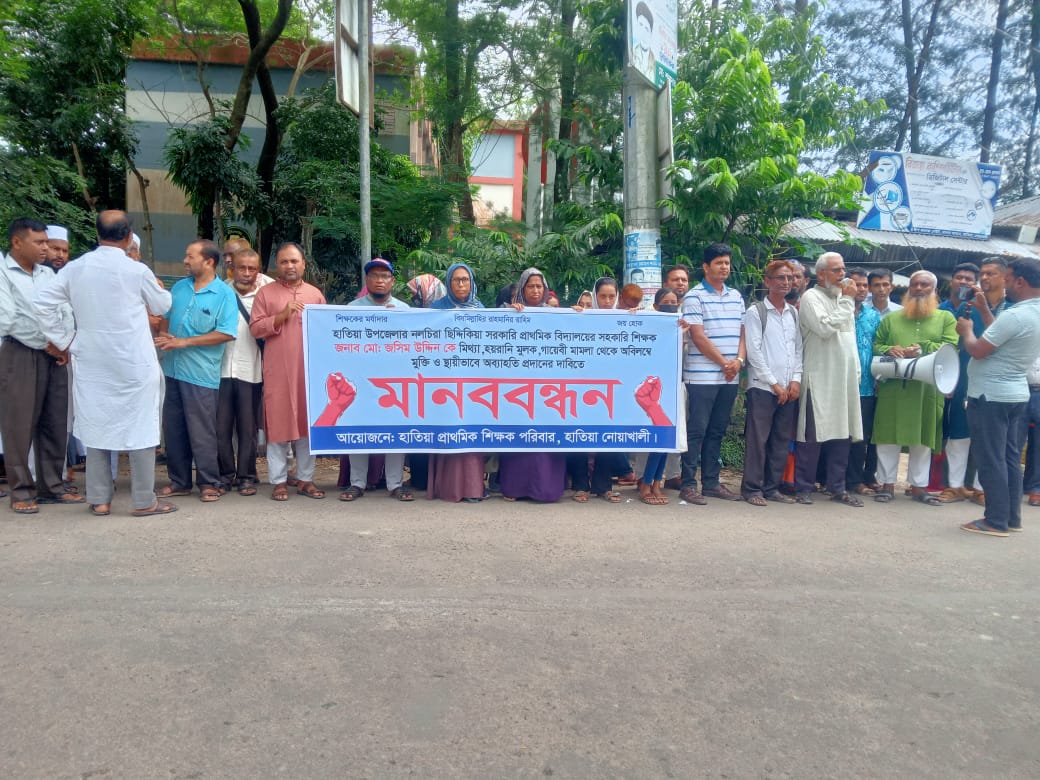 হাতিয়ায় নলচিরা ছিদ্দিকিয়া সরকারি প্রাথমিক বিদ্যালয়ের সহকারি শিক্ষক মো: জসিম উদ্দিন কে মিথ্যা ও গায়েবী মামলা থেকে মুক্তি ও স্থায়ীভাবে অব্যাহতির দাবিতে মানববন্ধন করেছে উপজেলা প্রাথমিক শিক্ষক পরিবার।