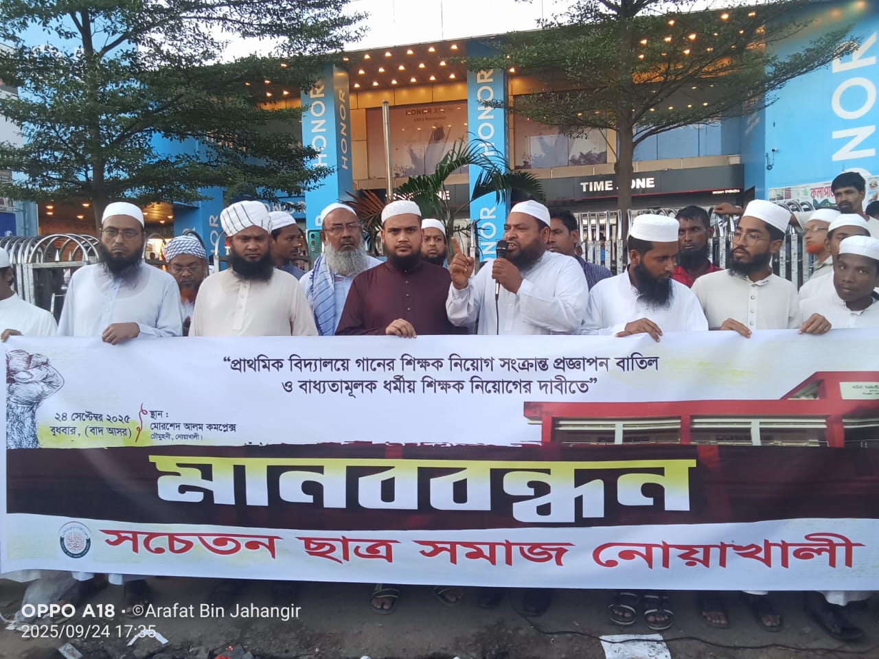 বুধবার (২৪ সেপ্টেম্বর) বাদ আছর, চৌমুহনী মোরশেদ আলম কমপ্লেক্স এর সামনে সচেতন ছাত্র সমাজ নোয়াখালী এর উদ্যোগে মানববন্ধন কর্মসূচি পালন করা হয়।