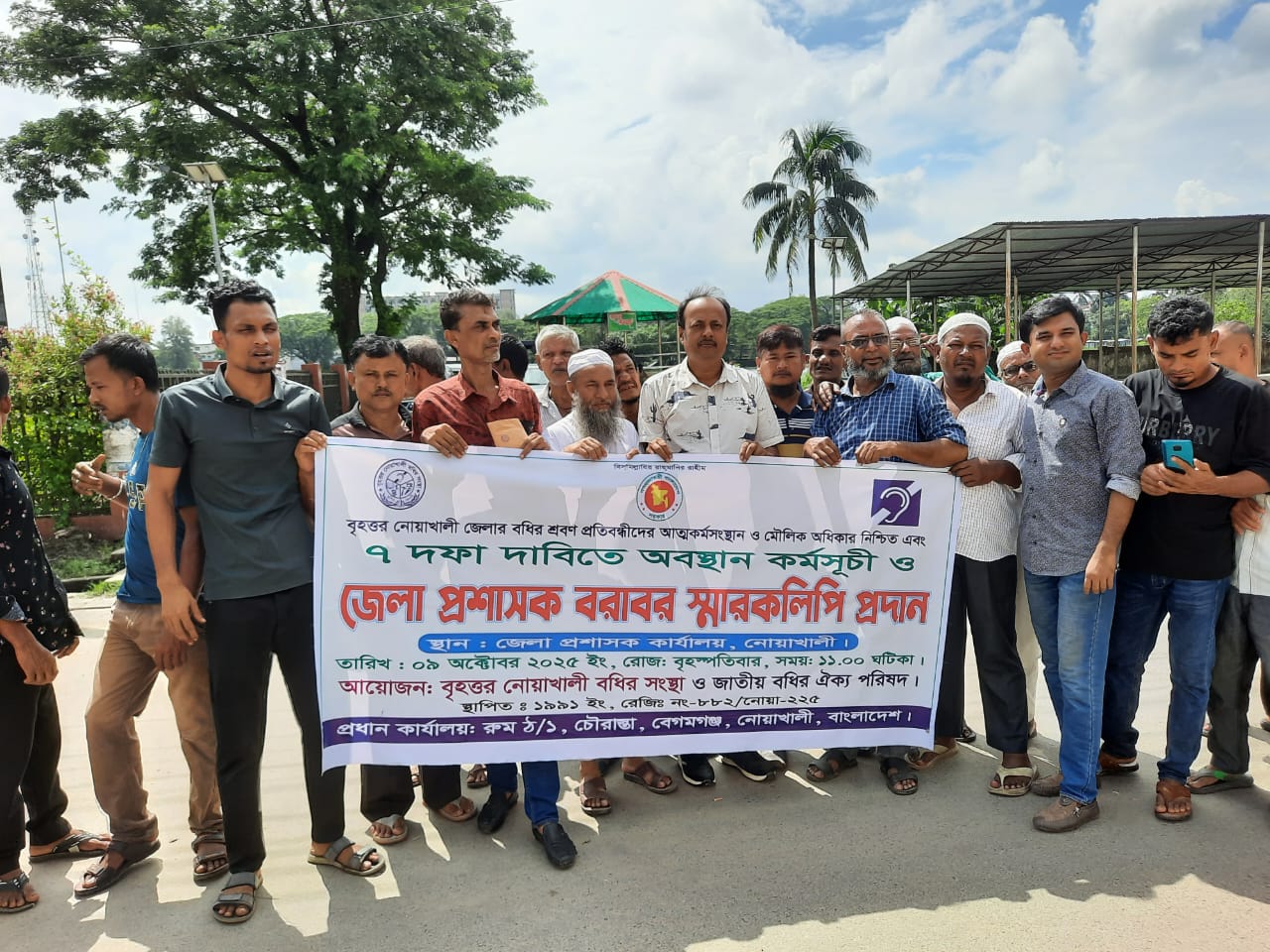 বৃহত্তর নোয়াখালী বাক ও শ্রবন প্রতিবন্ধী সংগঠনের ৭দফা দাবিতে এক অবস্হান কর্মসূচী ও মানববন্ধন অনুষ্ঠিত হয়।মানববন্ধন শেষে জেলা প্রশাসক বরাবর এক স্মারক লিপি প্রদান করেন বধির সংগঠনের নেতৃবৃন্দ।