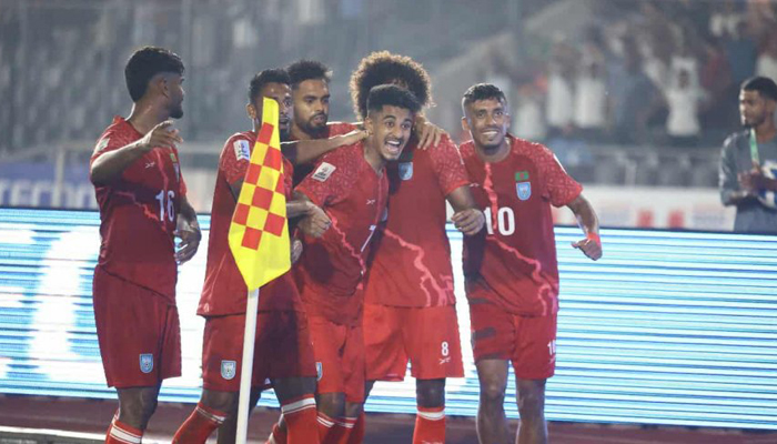 ১৩ মিনিটে গ্যালারিতে আনন্দের বন্যা। গোল করে এগিয়ে যায় বাংলাদেশ। হামজা চৌধুরীর ডান পায়ের বাঁকানো ফ্রি-কিক এক ডিফেন্ডারের মাথা ছুঁয়ে গোলকিপারের ওপর দিয়ে জড়িয়ে যায় জালে। এটি লাল সবুজ জার্সিতে হামজার দ্বিতীয় গোল। গত জুনে প্রীতি ম্যাচে ভুটানের বিপক্ষে প্রথম গোল এসেছিল।