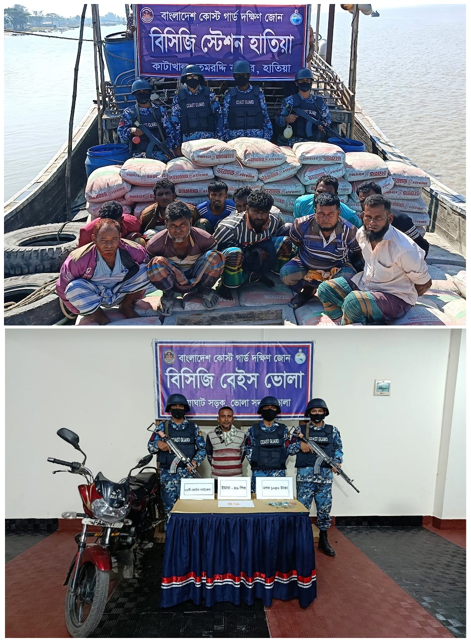 নোয়াখালীর হাতিয়া ও ভোলায় কোস্ট গার্ডের পৃথক দুটি অভিযানে অবৈধ সিমেন্ট, ইয়াবা, নগদ অর্থ ও মোটরসাইকেলসহ ১২ জন মাদক পাচারকারি আটক।